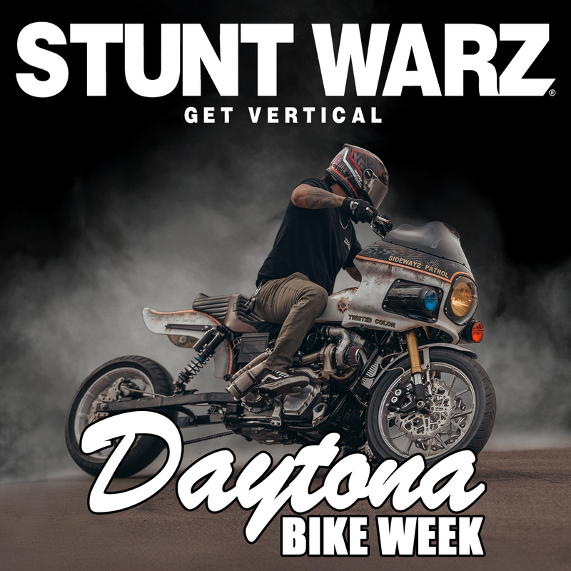 At Teddy Morse’s HD during Daytona Bike Week, elite V-Twin stunt teams go head-to-head. Four athletes per team. Two five-minute runs.